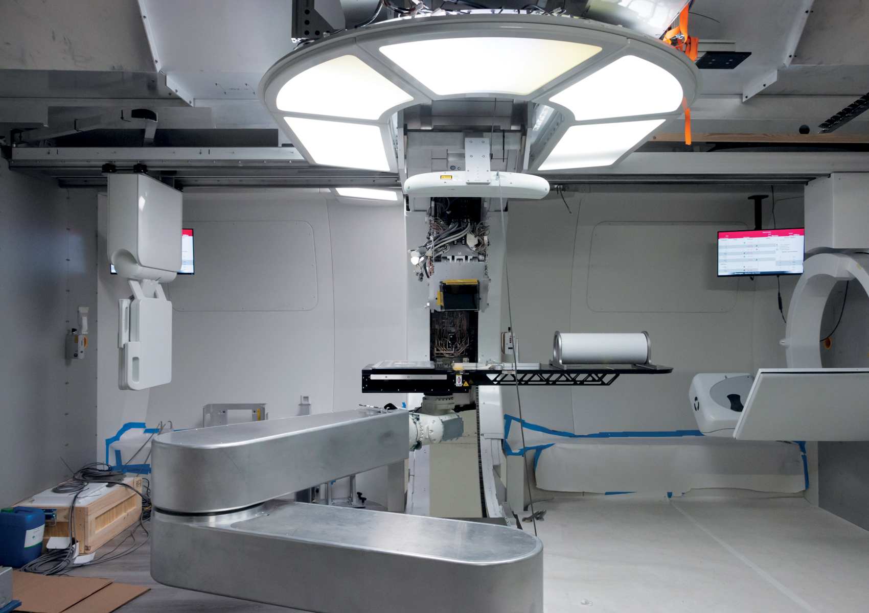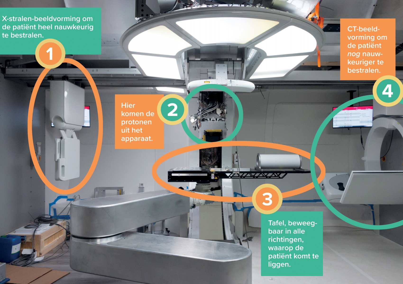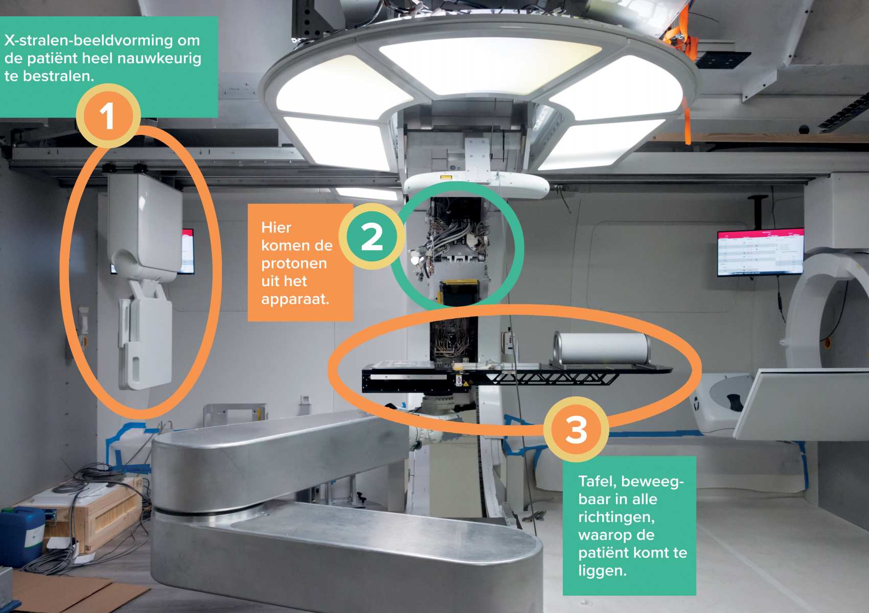 Het apparaat ziet er voor patiënten wellicht klein uit, maar achter de façade gaat een drie verdiepingen hoge protonenversneller schuil. Daarvoor moest ingrijpend gesloopt en verbouwd worden. Jacobs: ‘Terwijl we – als eerste in Europa – een compacte versie kochten, een uiterst innovatieve bovendien, die relatief weinig energie gebruikt.’ De bestuursvoorzitter voorziet niet alleen effectievere behandelingen, maar ook baanbrekend onderzoek: ‘Hier werken naast radiotherapeutisch laboranten en artsen ook onderzoekers, samen goed voor meer dan honderd wetenschappelijke publicaties per jaar. We kunnen kankeronderzoek en -behandelingen een nieuwe impuls geven. Samen met ASN Bank en Rabobank – die ieder 12,5 miljoen euro financieren van het 41 miljoen euro kostende project – en andere financiers als de provincie.’