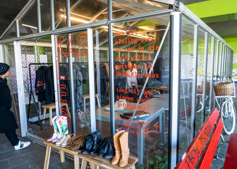 Je kan er zomaar tijdens een fietstochtje terechtkomen: in de Klerekas onder een viaduct in de Amsterdamse Kolenkitbuurt. ‘Een bijzonder, sociaal project op een onverwachte plek’, aldus Van den Broek. ‘Hergebruik is veel duurzamer dan recycling.’ Iedere dag wordt hier, onder de Leeuwendalerstunnel, kleding geruild. Buurtbewoners draaien de ‘winkel’, maar bovenal is het een ontmoetingsplek voor buurtbewoners. Mensen stoppen voor een kop koffie en een praatje.